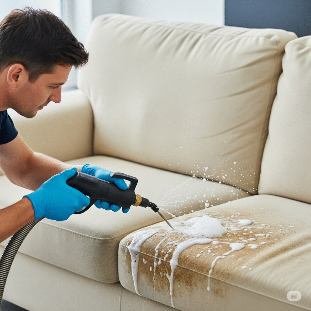 - Equipamentos de Extração: As extratoras profissionais são o coração da limpeza de estofados. Elas injetam uma solução de limpeza no tecido e, simultaneamente, sugam toda a água suja, junto com a sujeira, os resíduos e os microrganismos. Esse processo garante uma limpeza profunda, que a aspiração comum jamais alcançaria.
